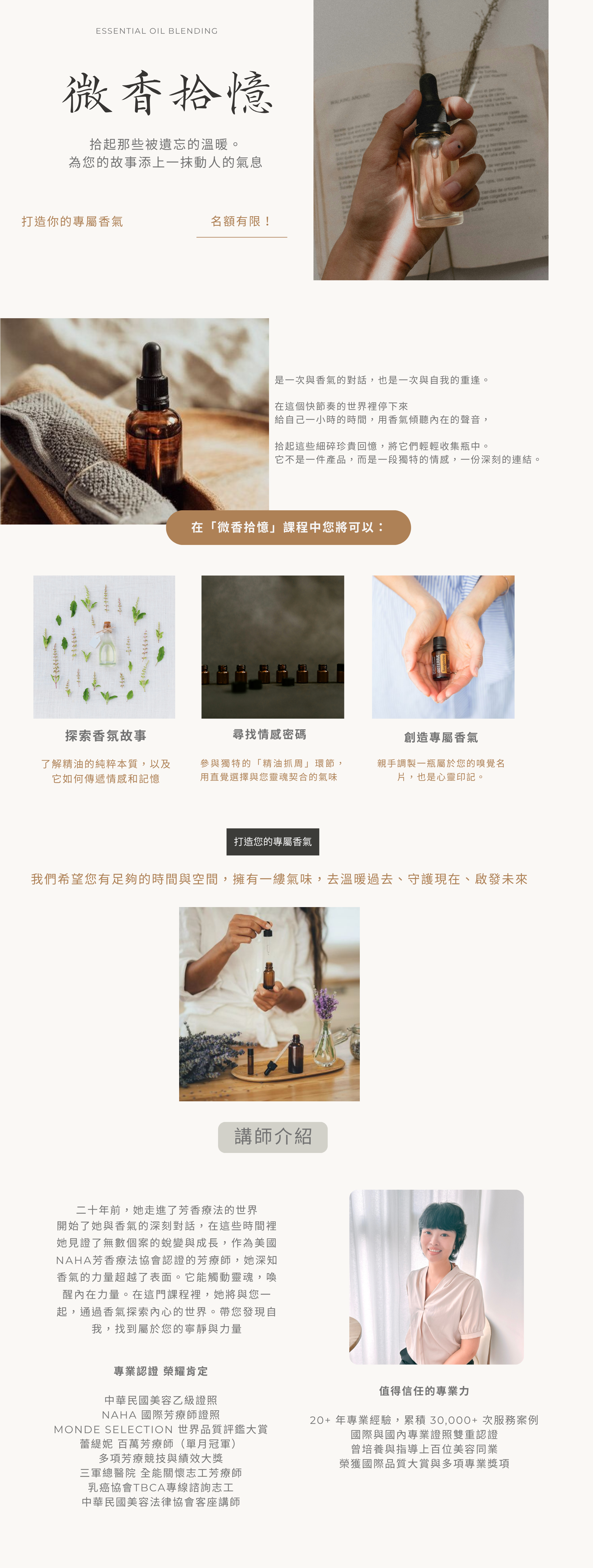 Amber 將帶領學員以專業芳療結構為基礎,重新連結「氣味 × 情緒 × 記憶」,